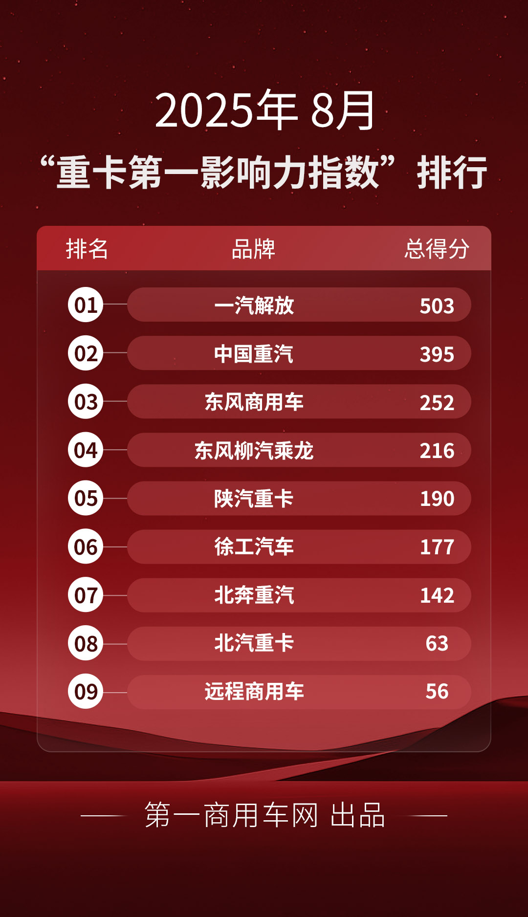 解放斷層領(lǐng)先 陜汽/北奔晉級 8月重卡影響力榜單出爐