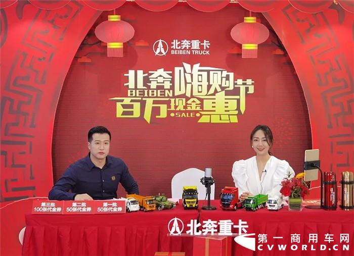 回到直播間,由北奔重汽營銷公司常務(wù)副總經(jīng)理易博宣布直播間百萬代金券搶購政策、金融展期政策和二手車置換政策。