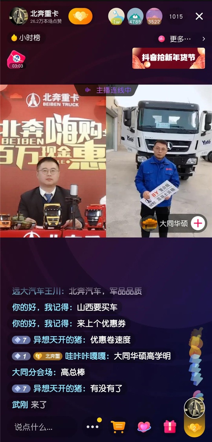 0為了提升北奔品牌和產(chǎn)品的知名度,進(jìn)一步探索線上營銷模式,助力北奔重汽“決戰(zhàn)一季度,勇奪開門紅”勞動(dòng)競賽,搶抓一季度訂單,同時(shí)考慮到疫情反復(fù),讓卡友可以足不出戶就能買到心儀的車輛。2021年1月17日下午,北奔重汽舉行了以 “北奔嗨購節(jié),百萬現(xiàn)金惠”為主題的北奔重卡新春訂購會(huì),開創(chuàng)了新的直播嗨購模式,回饋廣大客戶,給卡友送去實(shí)實(shí)在在的福利。
